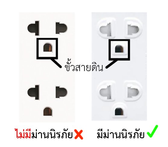 เต้ารับจะต้องมีม่านนิรภัยและมีขั้วสายดิน เพื่อป้องกันการสัมผัสโดน